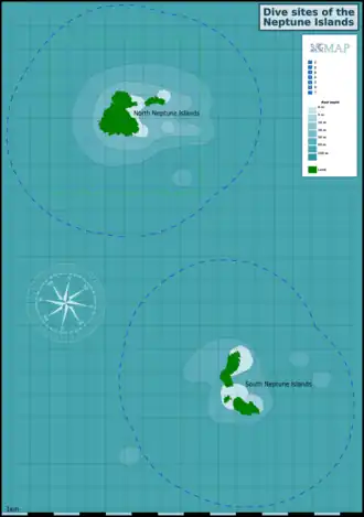 ![]() Dive sites of the Neptune Islands | |