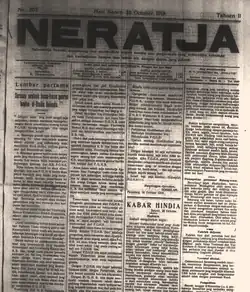 There were other newspapers with the name Neratja, such as one supported by the Dutch side in Medan during the Indonesian Revolution,[1][2] a communist magazine from the 1930s called Neratja Masjarakat,[3] and a Neratja printed in Jawi script Malay in Singapore in 1913.[4]