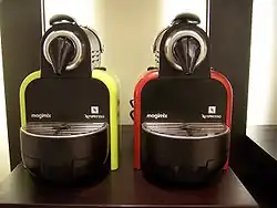 Nestlé Nespresso S.A., trading as Nespresso, is an operating unit of the Nestlé Group, based in Vevey, Switzerland.[4] Nespresso machines brew espresso and coffee from coffee capsules (or pods in machines for home or professional use[5]), a type of pre-apportioned single-use container, or reusable capsules (pods), of ground coffee beans, sometimes with added flavorings. Once inserted into a machine, the capsules are pierced and processed. Water is then forced against a heating element at high pressure meaning that only the quantity for a single cup is warmed.[6] By 2011 Nespresso had annual sales in excess of 3 billion Swiss francs. The word Nespresso is a portmanteau of "Nestlé" and "Espresso", a common mechanic used across other Nestlé brands (Nescafé, BabyNes, Nesquik).