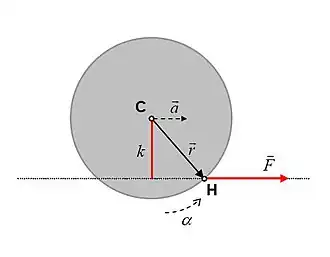 In the example shown in the diagram opposite, a single force acts at the application point H on a free rigid body. The body has the mass and its center of mass is the point C. In the constant mass approximation, the force causes changes in the body motion described by the following expressions: