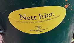 - ^ Aktuell, S. W. R. (2025-01-03). "Jeder kennt die "Nett hier"-Sticker: Baden-Württemberg auf der ganzen Welt bekannt". SWR Aktuell (in German). Retrieved 2025-06-23.