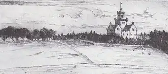 The 1856 OS map shows an L-shaped building at the site of the later 'castle' with a detached outbuilding nearby and a saw pit close to the house. A Nettlehirst Townhead is marked nearby, lying to the north-west of the house. Few trees are indicated and the mausoleum was not yet built. A driveway led down to the road with a 'lodge-like' building at the entrance. No grooms cottage existed at that time.[1] The 1895 OS shows the groom's cottage and stables, a much larger house, extensive tree planting, but no lodge house, outbuildings or sawpit. Nettlehirst Townhead is not named as such however the building is marked, somewhat enlarged and now L-shaped. A burial ground is shown at the end of a long path. A footpath runs from the house area down to Giffen Station.[2] In 1902 a footpath connected the burial ground directly to Giffen Station and the road to South Barr and Gatend. The Nettlehirst Mains buildings are smaller and partly roofless.[3]