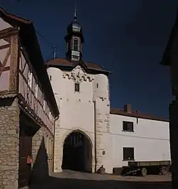 - Kandelpforte 4 – gate tower of the village fortifications, Kandelpforte ("Uhrturm", or clocktower), 14th century, Baroque half-hip roof, 18th century, tower clockwork, about 1700, roadway raised in 1906