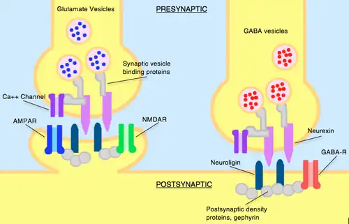- ^ a b c Levinson JN, El-Husseini A (October 2005). "Building excitatory and inhibitory synapses: balancing neuroligin partnerships". Neuron. 48 (2): 171–4. doi:10.1016/j.neuron.2005.09.017. PMID 16242398.