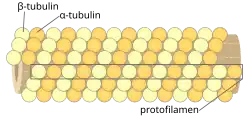 Neurotubules are microtubules found in neurons in nervous tissues.[1] Along with neurofilaments and microfilaments, they form the cytoskeleton of neurons. Neurotubules are undivided hollow cylinders that are made up of tubulin protein polymers[2] and arrays parallel to the plasma membrane in neurons.[3] Neurotubules have an outer diameter of about 23 nm and an inner diameter, also known as the central core, of about 12 nm. The wall of a neurotubule is about 5 nm in width. There is a non-opaque clear zone surrounding the neurotubule and it is about 40 nm in diameter.[3] Like microtubules, neurotubules are greatly dynamic and their length can be adjusted by polymerization and depolymerization of tubulin.[4]