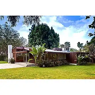 Neutra/Maxwell House, referred to as the Maxwell House, is a Los Angeles Historic-Cultural Monument (No. 808) located in Angelino Heights, Los Angeles, California. It is a 1,200-square-foot (110 m2) Mid-Century modern house built c.1941, designed by Richard Neutra. It was relocated in 2008 from its original location at 475 North Bowling Green Way in Brentwood, Los Angeles thanks to the efforts of Barbara Behm. The Charles and Sybil Maxwell House was designed and built by Neutra for the two musicians, she a violinist and he a composer, who wanted "acoustically suitable living quarters" on a budget of $6,750. Her practice room is farthest away from the composers study. There is a nice integration of sloping and flat roofs with the introduction of a glass triangle into the redwood siding. It was with this project that Neutra first experimented with the peaked roof and triangular glazed gable openings that later became a trademark of the firm when pitched roofs were mandated by city building codes. Further, this design element profoundly influenced the design of American suburban architecture in the 1950s and 60s.