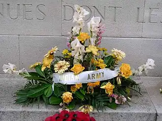 English: To the honour of the Army of India which fought in France and Belgium, 1914–1918, and in perpetual remembrance of those of their dead whose names are here recorded and who have no known grave [1][2] French: En honneur de l'Armee de l'Inde qui a combattu en France et en Belgique 1914–1918, et pour perpetuer le souvenir de ses morts aux tombes inconnues dont les noms sont ici graves.[3] | |