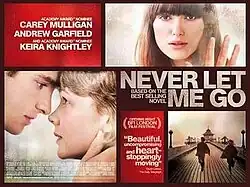 Never Let Me Go is a 2010 British dystopian romantic drama film based on Kazuo Ishiguro's 2005 novel of the same name. The film was directed by Mark Romanek from a screenplay by Alex Garland. Never Let Me Go is set in alternative history and centres on Kathy, Ruth, and Tommy, portrayed by Carey Mulligan, Keira Knightley, and Andrew Garfield, respectively, who become entangled in a love triangle. Principal photography began in April 2009. Filming locations included Andrew Melville Hall and Forest School, Walthamstow.[2] The film was produced by DNA Films and Film4 on a US$15 million budget.