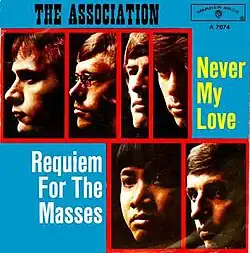 The first recording of "Never My Love" to achieve success was by the Association, an American sunshine pop band from California. Their version of the song, recorded with members of the Wrecking Crew,[6] peaked at number two on the Billboard Hot 100 chart, kept out of the number one spot by "The Letter" by the Box Tops,[7] and hit number one on the Cashbox charts in October 1967, one of the band's five top-ten hits in the late 1960s.[8] Their third number 1 on the Cashbox Top 100 Singles Chart, following "Cherish" (1966) and "Windy" (1967), it was featured on the band's album Insight Out (1967). The song also reached number one in Canada's RPM charts.