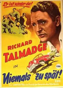 Never Too Late is a 1935 American crime film directed by Bernard B. Ray and stars Richard Talmadge, Thelma White and Robert Frazer.[1]