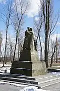 The monument depicts a man embracing a woman and child. On the pedestal is an inscription: NEVER WAR (Polish: NIGDY WOJNY).
