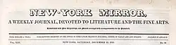 The New-York Mirror was a weekly newspaper published in New York City from 1823 to 1842. Founded by George Pope Morris and Samuel Woodworth, it was a prominent publication that focused on literature, the fine arts, and local news. It played a significant role in American cultural and literary life during the early 19th century, serving as an influential platform for many notable figures in the arts and letters of the time.