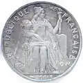 The overall design of the New Caledonia coins did not change from their introduction until their withdrawal in 2023. The obverse was identical to that of the French Polynesian coins. The only changes were the removal of the text Union Française after 1952 on the reverse, and the addition of the issuer initials "I.E.O.M" (Institut d'émission d'outre-mer) to the obverse in 1972.[2]