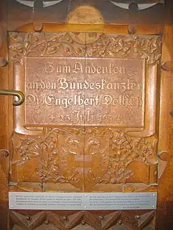 In October 2006 the Catholic Church added a plaquet to the commemorative wood cut for Engelbert Dollfuß at the New Cathedral, which caused excitement in the ÖVP. In the plaque the church, by resolution of the Austrian Conference of Catholic Bishops, distances itself from the original cut and proclaims the future abstention from party politics. Dollfuß as acting Chancellor of Austria in 1933 eliminated the parliament over formal irregularities. This caused the Austrian Civil War and led to a dictatorship.[2][3]