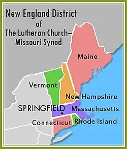 The New England District is one of the 35 districts of the Lutheran Church – Missouri Synod (LCMS), and encompasses all six New England states: Maine, New Hampshire, Vermont, Massachusetts, Rhode Island and Connecticut. In addition, three congregations in southwest Connecticut are in the non-geographic SELC District. The New England District includes approximately 70 congregations and missions, subdivided into 9 circuits, as well as 24 preschools and 5 elementary schools. Baptized membership is over 22,000; with New England's total population standing at 14,240,000 as of 2005, the District's membership represents only 0.16% of the local population – the lowest of any of the LCMS' 33 geographical districts.