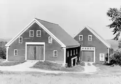 The New England Barn was the most common style of barn built in most of the 19th century in rural New England and variants are found throughout the United States.[1] This style barn superseded the ”three-bay barn” in several important ways. The most obvious difference is the location of the barn doors on the gable-end(s) rather than the sidewall(s). The New England and three bay barns were used similarly as multipurpose farm buildings (housing animals, crop storage and other uses all in one building) but the New England barns are typically larger and have a basement. Culturally the New England Barn represents a shift from subsistence farming to commercial farming[2] thus are larger and show significant changes in American building methods and technologies.[3] Most were used as dairy barns but some housed teams of oxen which are generally called teamster barns. Sometimes these barns are simply called “gable fronted” and “gable fronted bank barns[4] but these terms are also used for barns other than the New England style barn such as in Maryland and Virginia[5] which is not exactly the same style as found in New England. A similar style found in parts of the American mid-west and south is called a transverse frame barn[6] or transverse crib barn.[7][8][9][10][11]