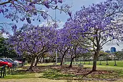 New Farm Park's 15.0076 hectares (37.085 acres) currently contains a wide variety of trees, both mature and recent plantings, including jacarandas, poincianas, figs, palms, and coral trees. The central lawn within the jacaranda drive contains the remnants of the post-1948 rose garden arrangements, and an area of rainforest has been planted behind the library. In the shade of the trees near the kiosk site is an understorey of tropical plants, a character of park planting that is a distinct aspect of Brisbane's historic parks and large gardens.[1]