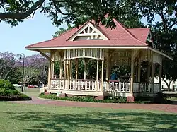 The bandstand in the shape of a rotunda was also built in the Federation Queen Anne style. In July 1915 the £359 tender of Legge, Gladwin and Co was accepted, construction to take 6 weeks.[3] Until the kiosk burnt down in 2000, it was one half of the last surviving kiosk-bandstand related group in Queensland. A kiosk and bandstand were built in Albert Park in 1911, a bandstand at Bowen Park (1914), and kiosks were built in the City Botanic Gardens, Moora Park (Sandgate) and Mount Coot-tha Lookout.[1]