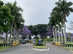 Vehicle access occurs at the Oxlade Drive entrance, and the Library carpark. The main pedestrian entrances are at Dixon Street, the corner of Sydney Street and Brunswick Street, the old vehicle entrance on Brunswick Street between Sydney Street and Elystan Street, a path opposite Elystan Street, and a path running from the site of the old ferry terminal at the end of Brunswick Street. The jacaranda drive still follows its original course, and two of the original footpath routes within the drive still exist, radiating out from near the Oxlade Drive vehicle entrance. A new path runs between the kiosk site and the playground, and another new path links New Farm Park to the Brisbane Powerhouse.[1]