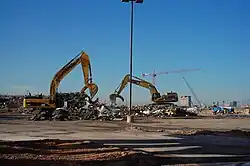 The New Frontier was the last of the Hughes-era casinos to be demolished.[201] After a five-minute fireworks show, the 16-story Atrium Tower was imploded on November 13, 2007, at 2:37 a.m. to the thousands of spectators that turned out to view the demolition.[201][120] The tower was imploded by Controlled Demolition, Inc., which had worked on other Las Vegas hotel implosions. The interior was stripped down allowing for the insertion of dynamite, totaling 1,040 pounds and spread across 6,200 different areas of the tower.[203][120] The implosion left a four-story pile of concrete, glass and steel remains.[120] Two low-rise hotel wings were demolished with the use of an excavator, although the discovery of asbestos slowed the process down.[204]