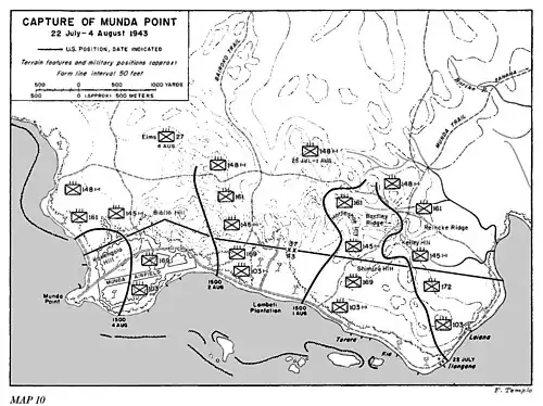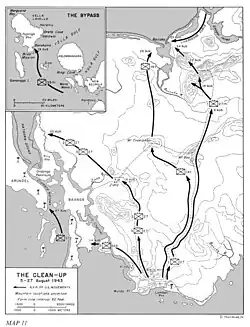 Beginning 3 August, Liversedge tried again, first establishing a battalion of the 148th Infantry Regiment at a blocking position on the Munda trail. Two days later he relieved these men with a combined Army/Marine force and moved the 148th to a dominant position overlooking the entire area. On 10 August, Liversedge picked up another US battalion and renewed the direct attack on Bairoko.[47] At the same time, two regiments from the 25th Infantry Division, sent to New Georgia as reinforcements, advanced on Bairoko from Munda Point mopping up after the capture of Munda airfield.[48] After two more grueling weeks, the Americans entered Bairoko unopposed on 24 August.[47]