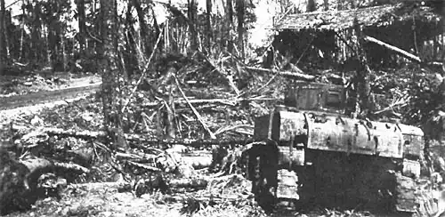 Sasaki initially took advantage of the disorder on the American side. The Japanese learned to apply close assault tactics against American tanks, rendering armor even less effective in the jungle than usual. Meanwhile, the inexperienced, hungry and fatigued US soldiers' nerves began to fray, and they began to lose their fire discipline.[40] On the night of 17 July, the Japanese launched a strong counterattack and succeeded in overrunning the command post of the 43rd Division near Zanana. Eventually, however, Sasaki's troops became sick and exhausted; also, he had lost communications with Rabaul.[41] US forces, bolstered by the arrival of the 37th Infantry Division, subsequently launched a corps-level offensive under Griswold aimed at capturing Munda Point.[42] Sasaki ordered a retreat from the Munda area on 3 August. Griswold had his men sweep around Munda to the northwest and on 5 August plastered the remaining Japanese with artillery fire. That day, the Americans moved unopposed into Munda, finally achieving the campaign's most important goal.[41]