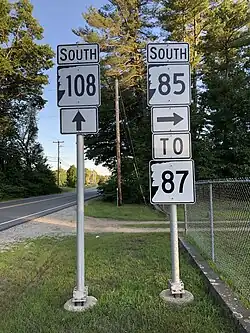 New Hampshire, in contrast to most other states, normally signs route junctions using green guide signs (similar to those found on freeways) instead of individual sign and shield assemblies. New Hampshire also signs nearly all route concurrencies in the same way. However, as signs are being replaced, they are now more often replaced with traditional sign assemblies.