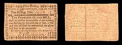 In 1742, following depreciation of the Old Tenor notes, "New Tenor" notes were issued worth 4 times the Old tenor notes. These were replaced, in 1755, by the "Lawful Money" issue. These notes were initially equal to their face value in sterling and replaced the previous issues at the rates of 1 Lawful shilling = 3⅓ New Tenor shillings = 13⅓ Old Tenor shillings. The "Colonial" issue of paper money was introduced in 1763, worth 1⅓ times the Lawful Money notes.[1]
