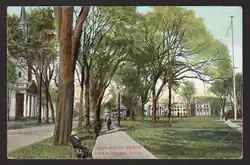 The New Haven Green is a 16-acre (65,000 m2) privately owned park and recreation area located in the downtown district of the city of New Haven, Connecticut, United States. It comprises the central square of the nine-square settlement plan of the original Puritan colonists in New Haven, and was designed and surveyed by colonist John Brockett.[3] Today the Green is bordered by the modern paved roads of College, Chapel, Church, and Elm streets. Temple Street bisects the Green into upper (northwest) and lower (southeast) halves.