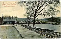 Between 1849 and 1850, two branch lines were constructed. The first was between Farmington and Collinsville, where it connected with Samuel W. Collins's Collins Company, a major manufacturer.[11] Sheffield envisioned this branch as the start of a longer route ultimately reaching Pittsfield and even Vermont.[12] The other was a short extension connecting Simsbury to Tariffville, which had a significant concentration of manufacturers.[4][13] Both opened in 1850, as did the extension of the main line to Granby. Almost immediately after they opened, the New York and New Haven leased these as well, effective April 25, 1850, for an additional $40,000 per year.[5]