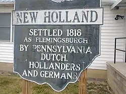 The town was originally founded as Flemingsburgh (or Flemingsburg)[4] on September 2, 1818, and was named for John Fleming, son of Captain Fleming of Berkeley County, Virginia, who settled in the area in 1802.[5] The name was later changed to New Holland between 1818 and 1827. The village was named after Holland, the native land of a share of the first settlers.[6]