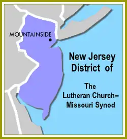 The New Jersey District is one of the 35 districts of the Lutheran Church – Missouri Synod (LCMS) and comprises the state of New Jersey and one congregation just across the state line in Milford, Pennsylvania; five of the state's congregations are in the non-geographic English District, and five more are in the SELC District. The New Jersey District includes approximately 54 congregations and missions (the fewest of any geographic district), subdivided into 6 circuits, as well as 24 preschools and 5 elementary schools. Baptized membership in district congregations is approximately 14,000.[1]