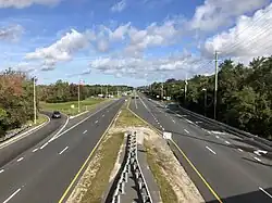 The highway enters Stafford Township and passes to the southwest of the residential Ocean Acres community.[1][3] The route heads to the southwest of Hackensack Meridian Health Southern Ocean Medical Center before it comes to the intersection of Nautilus Drive (CR 111). Past this intersection, Route 72 widens into a four-lane divided highway, intersecting with Lighthouse Drive (CR 105) and Stafford Park Boulevard (CR 2) before coming to an interchange with the Garden State Parkway.[1] Following this interchange, the route enters the Manahawkin area and widens to six lanes as it passes woods to the northeast and business areas to the southwest. Route 72 has an interchange with US 9 and continues southeast through a mix of woods and commercial areas as a four-lane road, with Bay Avenue (CR 50) paralleling the route to the north. The road intersects with Jennings Road (CR 20) and Mill Creek Road (CR 6) before it passes to the north of the Beach Haven West residential development and passes near wetlands.[1][3] A road provides access to Bay Avenue before Route 72 crosses the Manahawkin Bay on the Manahawkin Bay Bridge, also known as the Dorland J. Henderson Memorial Bridge.[1] After traversing two small islands consisting of a mix of residences and marshland, the road continues into Ship Bottom on Long Beach Island.[1][3] Upon entering Ship Bottom, the route splits into a one-way pair following West 9th Street eastbound and West 8th Street westbound.[1] Route 72 passes by resort businesses, intersecting with Barnegat Avenue (CR 4) and Central Avenue (CR 89) before ending at the intersection of Long Beach Boulevard (CR 607) a block from the Atlantic Ocean.[1][3]