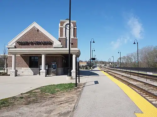 New Lenox is a commuter train station along Metra's Rock Island District line in New Lenox, a southern suburb of Chicago, Illinois. The station is officially located on 300 North Church Street, and lies 34.0 miles (54.7 km) away from LaSalle Street Station, the northern terminus of the line,[2] however parking is available between Church Street and far northeast of Haven Avenue. It is also the penultimate station along the RID line before reaching the end of the line at Joliet Transportation Center. In Metra's fare-based system, New Lenox station is in zone 4. As of 2018, New Lenox is the 49th busiest of Metra's 236 non-downtown stations, with an average of 1,046 weekday boardings.[1]