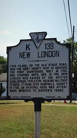 New London is currently an unincorporated community and former town in Campbell County, Virginia, United States. The site of the colonial community is eleven miles southwest of downtown Lynchburg. In 1754, Bedford County was formed and New London was established as the county seat.[1] Situated near the intersection of the Great Wagon Road and the Wilderness Road, the town was an important stopping point for settlers heading west.