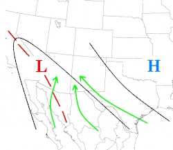 In early summer, the monsoon starts with a shift in wind patterns as Mexico and the southwest U.S. warm under intense solar heating.[4] The prevailing winds start to flow from somewhat cooler moist ocean areas into hotter, dry land areas.[3] Precipitation increases in late May to early June in southern Mexico and spreads along the western slopes of the Sierra Madre Occidental, reaching New Mexico and southeast Arizona in early July. It extends into the southwest United States as it matures in mid-July, when an area of high pressure, called the monsoon or subtropical ridge, develops in the upper atmosphere over the Four Corners region, creating wind flow aloft from the east or southeast.[5] At the same time, a thermal low (a trough of low pressure from intense surface heating) develops over the Mexican Plateau and the Desert Southwest of the United States.[6]