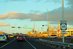 Through Rio Rancho, NM 528, known as Pat D'Arco Highway, is a major north–south street. It serves major retailers, restaurants, and other businesses. Feeder streets which connect adjacent neighborhoods cross Pat D'Arco Highway at regular intervals. It meets NM 448 again near its own northern end. The route ends at U.S. Route 550 (US 550) on the northern edge of Rio Rancho.[4]