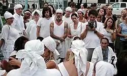 In the 21st century, various Voodoo groups wear white clothing for their ceremonies.[21] Influenced by Haitian Vodou, those assembled may dance around a central post, the poto mitan.[22] Patterned flags, called drapos, may be brought out, while songs are sung in Haitian Kreyol.[22] Drawings, called vèvè , may be made on the floor to invoke the spirits.[23] Offerings will be given to the spirits.[24] Contemporary Voodoo rites often entail calling spirits to enter the body of a practitioner, through which they can heal or confer blessings.[25] The possessed individual will be called the "horse".[24]