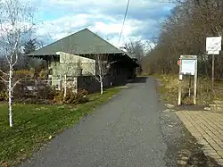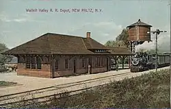 The Wallkill Valley Railroad, founded in 1866, stretched from Montgomery to Kingston. The New Paltz railroad station was originally built in 1870,[25] rebuilt after a 1907 fire.[26] The railroad and station later came under New York Central ownership. The NYC operated two trains a day, each direction, on a Kingston-New Paltz-Montgomery run. At Kingston, connections were available trains north to Albany and south to Weehawken, New Jersey.[27] The passenger service through New Paltz ended in 1937, and the rail division was abandoned by Conrail in 1983. The former roadbed was converted for use as the Wallkill Valley Rail Trail.[28]