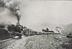 In 1901, NZR and the WMR co-operated to accelerate the train by eliminating the change of trains at Longburn. By this stage, the train ran every day except Sunday, and on four days a week NZR's train ran all the way through to Wellington, while on the other two days the WMR's train ran to New Plymouth.[9] This cut the travelling time down to 12 hours and 50 minutes,[4] and in 1902, NZR eliminated refreshment stops by introducing dining cars of its own. The Express was the second train in New Zealand to be equipped with dining cars, after the South Express, and thus the first in the North Island.[9]