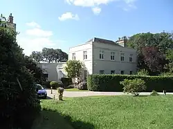 The house consists of a central stuccoed block of three floors with a basement divided into five bays, with a flanking pavilion of two stories in four bays, to either side connected by low flanking quadrant walls. In the centre of the front is a large classical pedimented portico fronted by four Ionic columns. The flanking walls screen the service wings behind. The rear elevation has on either side full-height semi-circular bays. The interior contains much Adam style decorative plasterwork, apparently the work of a certain Mr Powell referred to in the invoice from the builder Bellman,[26] and ornamental fittings. Robert Adam did much work for the Parkers at Saltram House near Plymouth between 1768–72 and 1779–82.[27] The Poles are likely to have been guests at their neighbours at this time, but in any case as they also spent much time in London at their house in Bedford Square, they would have been familiar with Adam's work in London and elsewhere. The north-east pavilion contains a theatre of c. 1900.[28] The top floor housed the servants' quarters.[29] The kitchens were originally situated in the left hand pavilion, later converted into a theatre.[30] A large Palladian style stables block is situated around a semi-circular courtyard, several hundred yards from the house, now converted into several separate residences. It had stabling for twelve horses and accommodation for grooms.