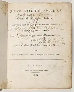 In 1802 Governor Philip Gidley King instructed the government printer, George Howe, to print a selection of General Orders issued from 1791 to 1802 in a single book.[2][3][4] The book was printed at Government Press in Sydney. The orders were indexed by subject to assist locating an order due to the large number of orders included.