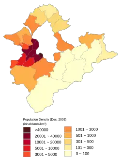 The county afterward had ten county-administered cities (Banqiao, Luzhou, Sanchong, Shulin, Tucheng, Xizhi, Xindian, Yonghe, Zhonghe); four urban townships (Ruifang, Sanxia, Tamsui, Yingge); and fifteen rural townships (Bali, Gongliao, Jinshan, Linkou, Pinglin, Pingxi, Sanzhi, Shenkeng, Shiding, Shimen, Shuangxi, Taishan, Wanli, Wugu, Wulai). It was further divided into 1,017 villages and 21,683 neighborhoods.[14] In August 1992, due to the adjustment of the demarcation line between Taipei City and Taipei County around Neigou and Daking Creeks, the area of Taipei County was decreased by 0.03 km2 (0.012 sq mi).[15] On 25 December 2010, Taipei County was upgraded to a special municipality as New Taipei City consisting of 29 districts with the modern Banqiao District as the municipal seat.[16]