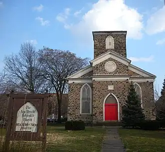 The present church was built in 1828 of stones taken from the original church, built in 1700. Construction was supervised by US Army engineer, Rene Edward De Russy, who led the construction of Fort Hamilton at New York harbor.[3][4] The parish house was built in 1892 and the parsonage in 1906.