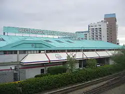 Westminster Quay was a mid-1980s development to revitalize New Westminster and accompanied the development of the SkyTrain line to Vancouver. In addition to a large public market and a 2.5-diamond-rated hotel, The Inn at the Quay, a large condominium tower and townhouse complex was built, accessed from the older Columbia Street area of downtown by an overpass. The impetus provided by this project has spilled over onto the inland side of the rail tracks, with new tower developments focusing on the area southwest of 8th Street (the area known formerly as "the Swamp" and Chinatown). As of July 2007, the Quay's commercial component had noticeably decreased, with many vacancies, compared to the much more active Lonsdale Quay Market in North Vancouver. Responding to the decrease of business, the ownership group closed the Westminster Quay Market for renovations. The market re-opened as The River Market in September 2010 with Donald's Market as the main anchor.[35] The Westminster Quay is also known to house a 9.75-metre-tall (32.0 ft) tin soldier which was given the title of the world's largest by the Guinness Book of World Records back in 2002.[36]