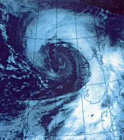 By 1200 UTC on 31 December 1991 an Atlantic low pressure centre of 985 mb had developed at the left exit of a strong WSW jet stream and was at 57°N 27°W. At this time a very sharp thermal trough (cold air) extended from south-west Iceland to the Hebrides with a thermal ridge building (warm air) behind it in the Atlantic.[3] A satellite image at 1600 UTC on 31 December showed a ‘clear eye’ in the cloud comma which indicates the dry air from the stratosphere descending into the developing low pressure as is a signature of explosive cyclogenesis. By 1800 UTC the low had deepened to 966mb.[3] At midnight (0000 UTC 1 January) the left exit of the jet stream was just behind the top of a sharp thermal ridge just west of Faroe, rapidly deepening the low centre to 957mb. Travelling at a speed of around 55 knots (63 mph; 102 km/h; 28 m/s), the low continued to deepen as it passed over Faroe and to the north of Shetland. Pressure falls were 5mb/hr across Shetland and 7mb/hr across Faroe.[3] The strongest winds arrived over the Shetland islands between 0100 UTC and dawn.[4]