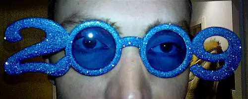 New Year's glasses are novelty eyeglasses in the numerical shape of the coming year usually worn during New Year's Eve parties.[1] They were invented and patented[2] by Richard Sclafani and Peter Cicero in 1992, although other companies have produced similar versions.[3] New Year's glasses' inspiration and popularity arose from the fact that the two digits in the middle of the year number (9 and 0 from the years 1990–2009) had holes suitable for looking through or mounting lenses into.[4]