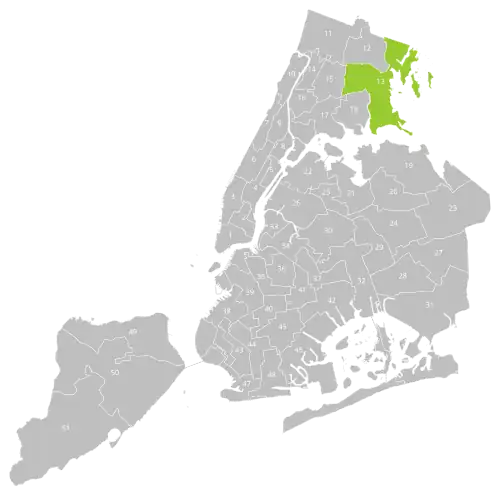 District 13 covers a series of smaller neighborhoods in the East Bronx, including Throggs Neck, Pelham Parkway, Morris Park, Pelham Bay, Pelham Gardens, Schuylerville, Country Club, Locust Point, and Westchester Square, as well as parts of Allerton and Van Nest.[4]