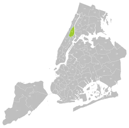 District 9 is based in Harlem in upper Manhattan, also covering smaller parts of East Harlem, Hamilton Heights, and Manhattanville.[4] St. Nicholas Park and Marcus Garvey Park are both located in the district.