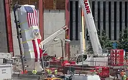 In 2011, ten years after the September 11 attacks, the ladder truck was made part of the National September 11 Memorial & Museum. The flag-covered, 60,000-pound truck was lowered by crane 70 feet below ground and observed by firefighters, victims’ families and other bystanders, as the FDNY Emerald Society performed "Amazing Grace" on bagpipes as they would at the funeral of a fallen FDNY member. It is intended to represent the members it lost on September 11 as well as all FDNY casualties.[5]